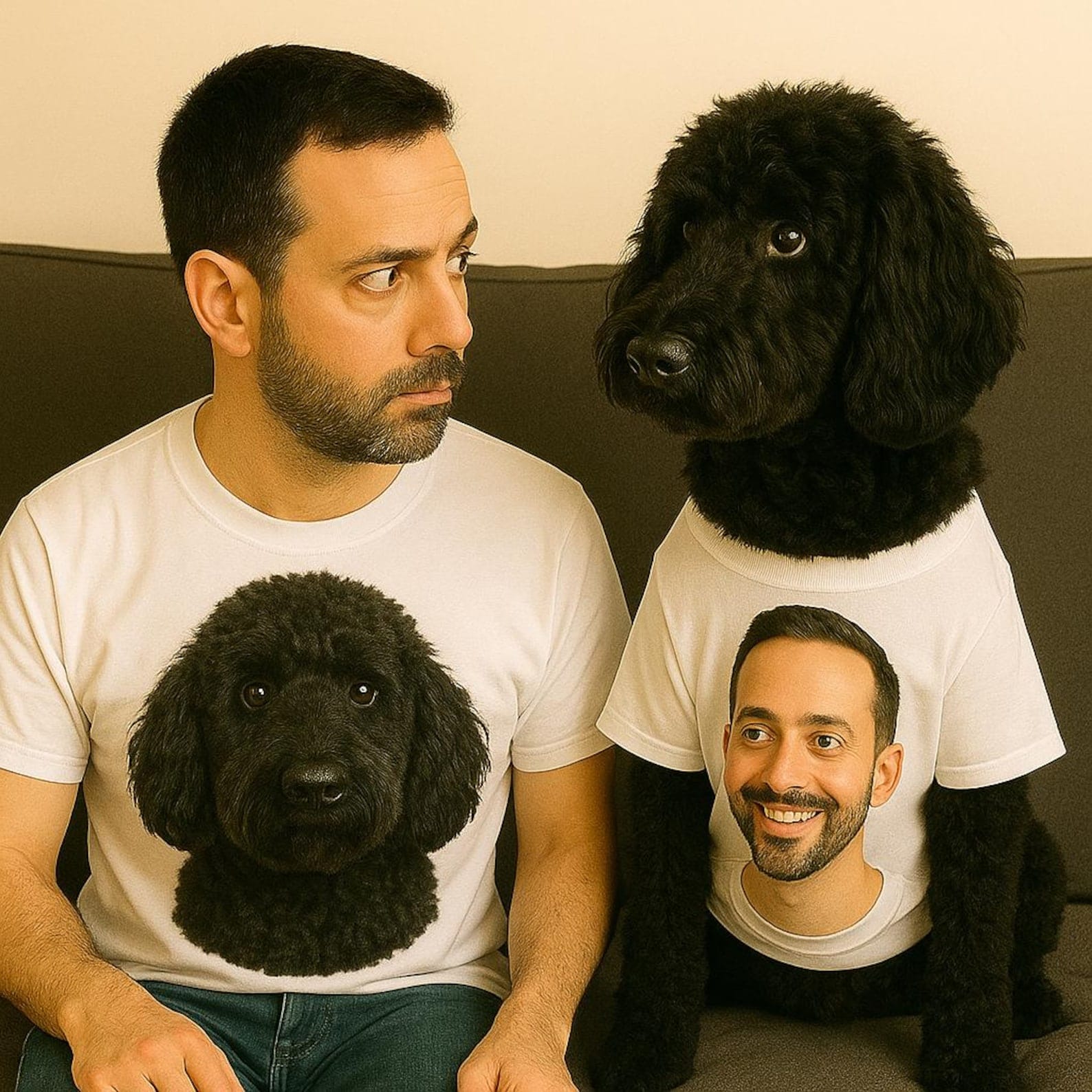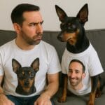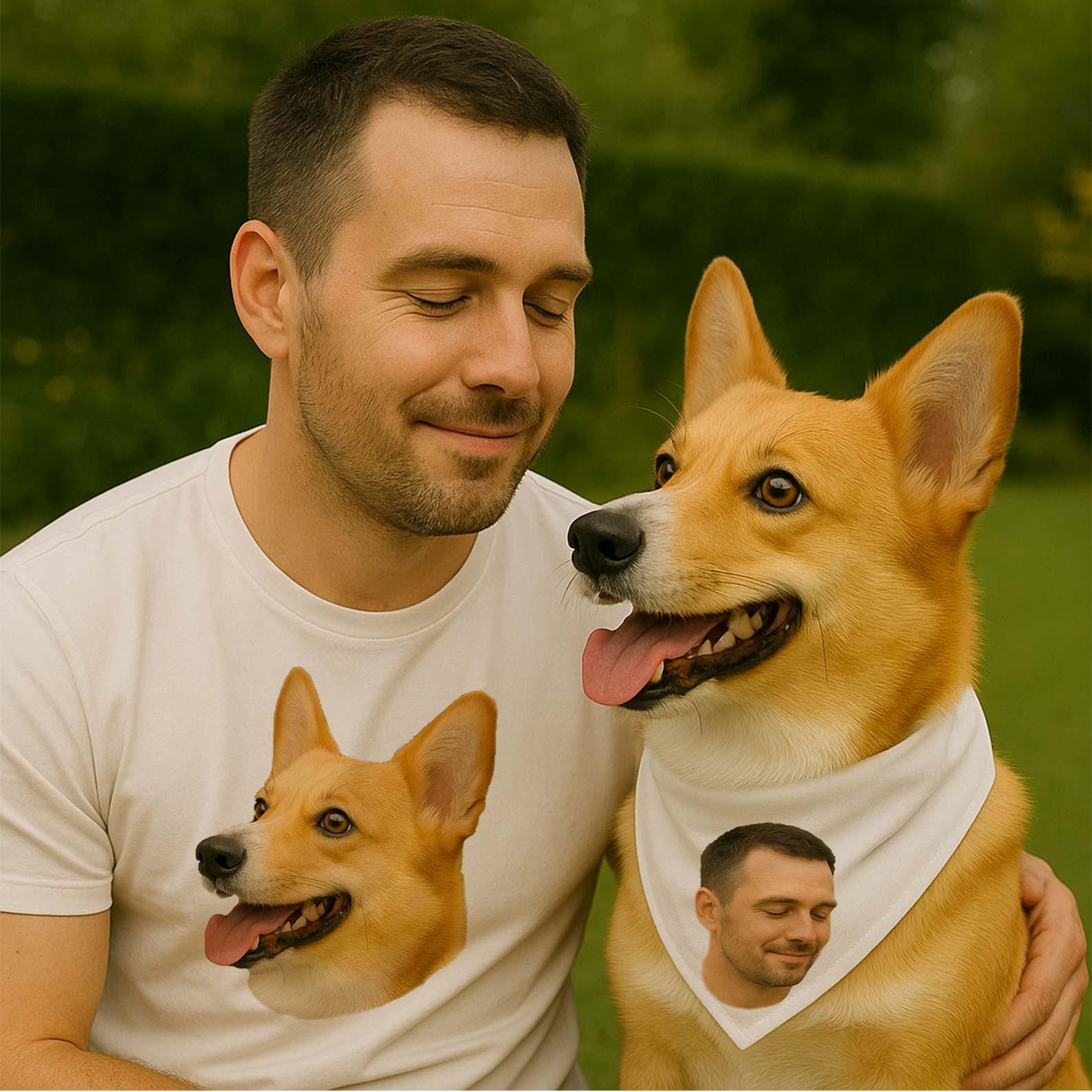 Each shirt is personalized with a photo of you and your pet, creating a hilarious and heartwarming pair — your shirt features your pet’s face, and your pet’s shirt features yours!